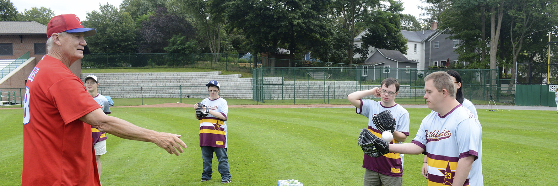Banner picture: Retired relief pitcher Dickie Noles, who helped the Phillies win the 1980 World Series, works with Pathfinder Village athletes on fielding during the third annual skills clinic held by members of the MLBPAA at Doubleday Field, Cooperstown. (Pathfinder Village photo).